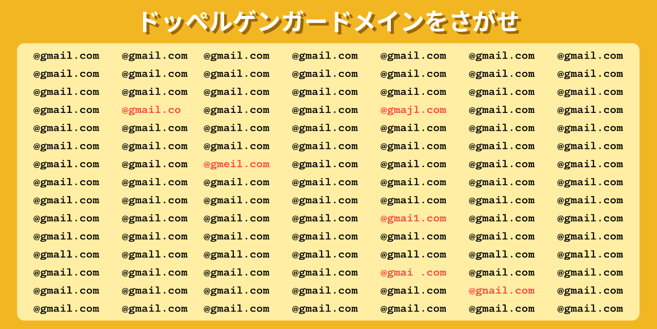 実際に2023年にも、とある大学で職員がGmail宛にメールを自動転送しようとしたところ、「@gmeil.com」宛に設定してしまい個人情報を含む情報が流出するなどの事件も起こっています。この事例では5年以上に渡り転送を続けていたとされており、ドッペルゲンガードメインの恐ろしさがわかります。
