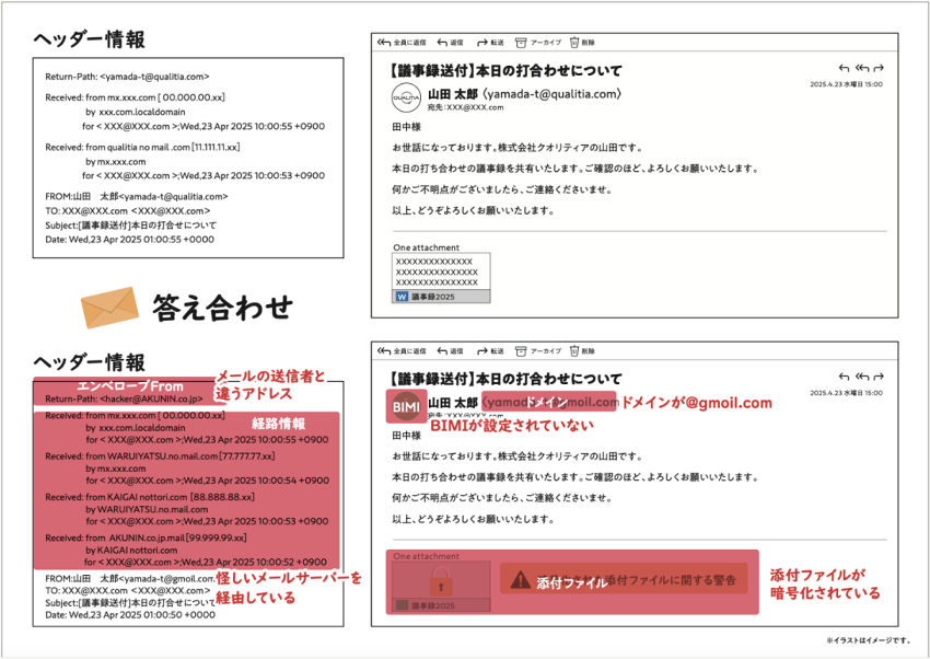まずはメールアドレスのドメイン部分です。正規メールはクオリティアのドメイン「@qualitia.com」となっていますが、なりすましメールは「@gmoil.com」となっています。あやしいメールを確認する際は、まずはメールアドレスを確認しましょう。「gmail」が「gmoil」になっているような似た文字に置き換えられているドッペルゲンガードメインなども存在しているため、注意して確認する必要があります。またメールに表示されているメールアドレスであるヘッダーFromは送信者が簡単に設定可能なので、正しいメールアドレスが表示されている場合でも注意が必要です。②BIMI