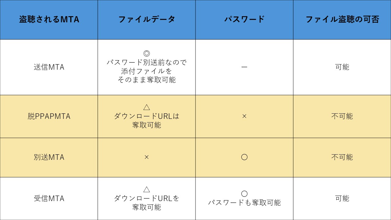 このように比較した時「パスワード通知を別のMTAから送付する」機能は、脱PPAPのMTAと別送MTAのどちらかが盗聴されていた場合には盗聴を防止する効果があると言えます。