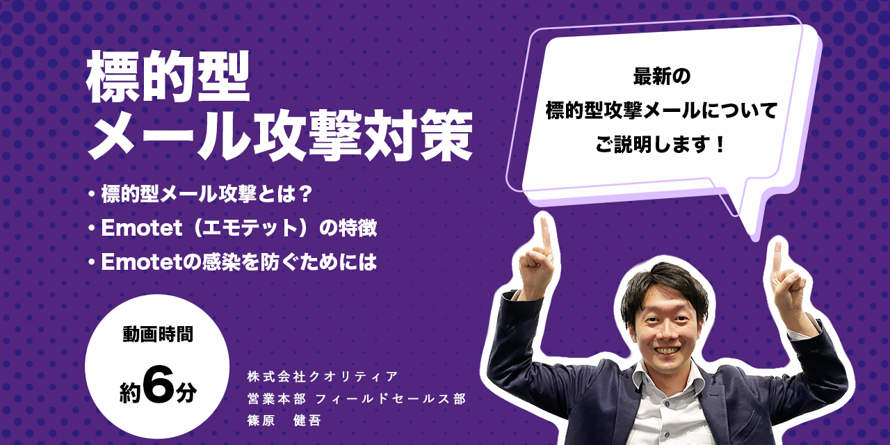 弊社 営業本部 セールスデベロップメント部 辻村 安徳(通称:つじーす)によるEmotetの感染をActive! zoneでブロックした実例をご紹介する動画となっております。